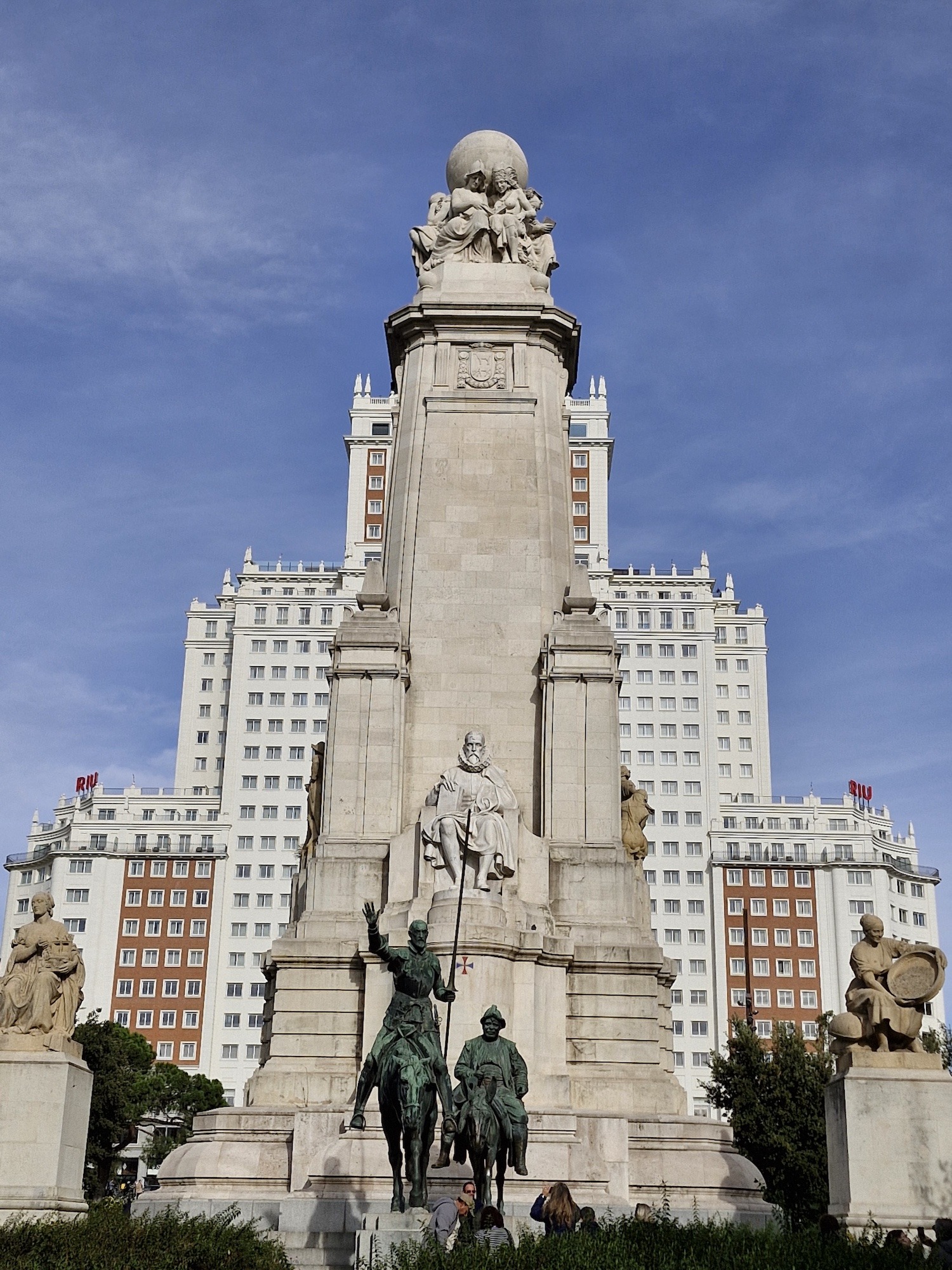Wenn man der Devise „Go West“ weiterhin treu bleibt, kommt man nach ca. 15 Minuten zum „königlichen“ Komplex. Der Königspalast, die neoklassizistische Almudena-Kathedrale sowie die Galerie der königlichen Sammlungen können – abhängig von der verfügbaren Zeit und Interesse – auch drinnen besichtigt werden. Last but not least durchaus empfehlenswert ist die Plaza de España, ca. 15 Minuten nördlich vom Königspalast entfernt. Im Zentrum des Platzes befindet sich ein monumentales Denkmal zu Ehren von Miguel de Cervantes. Insbesondere die dort stehenden überdimensionalen Skulpturen von Don Quijote und Sancho Panza sind beliebte Partner für Familien- und Gruppenfotos. Von hier aus, wo am südöstlichen Ausgang des Platzes die Gran Vía – eine famose Einkaufsstraße und eine wichtige Verkehrsader Madrids – beginnt (oder endet, je nachdem), kann man sich entspannt in Richtung Zentrum begeben, um in einem Restaurant oder einer der unzähligen Tapas-Bars das gerade Erlebte beim leckeren spanischen Essen Revue passieren zu lassen.