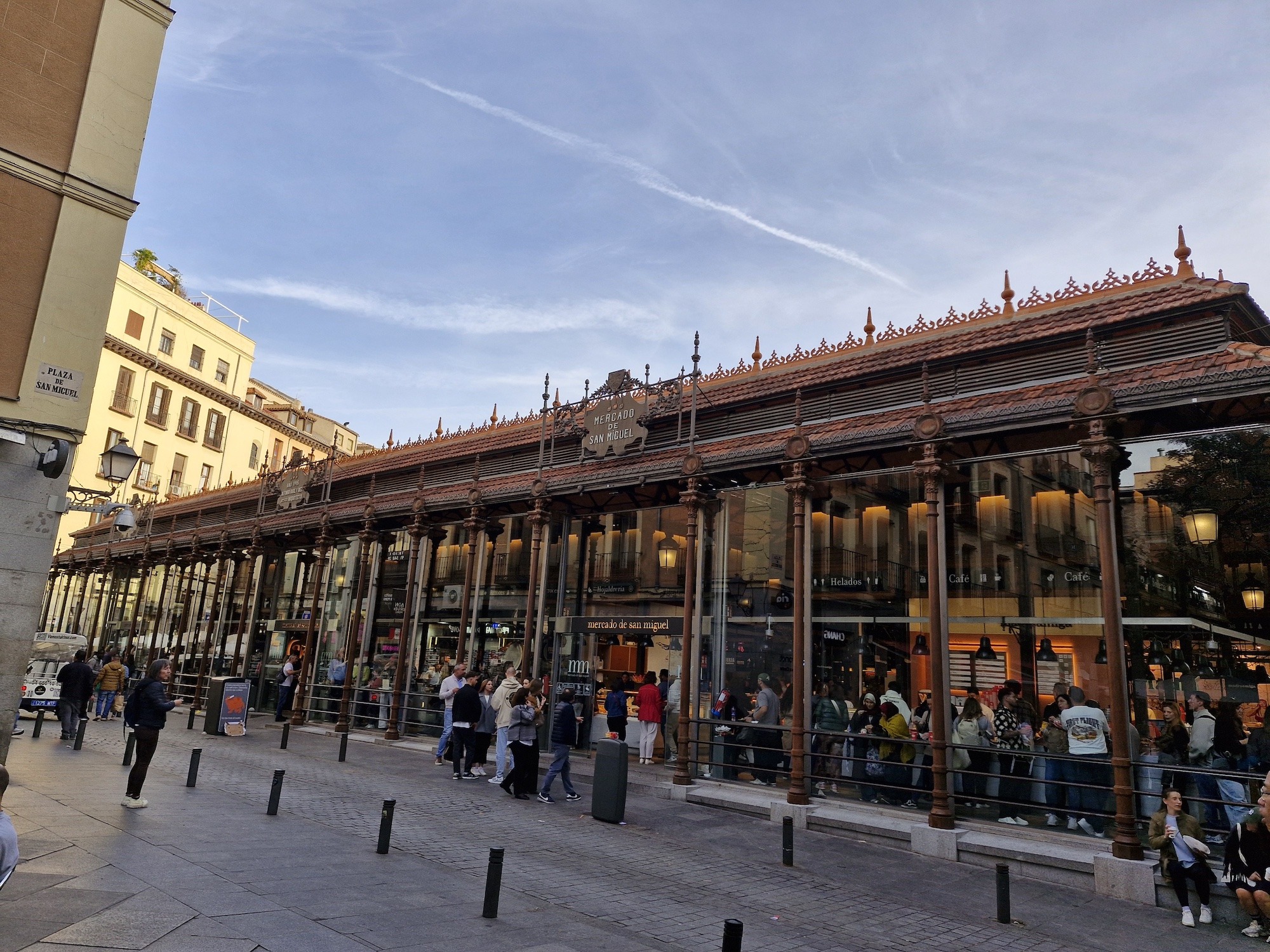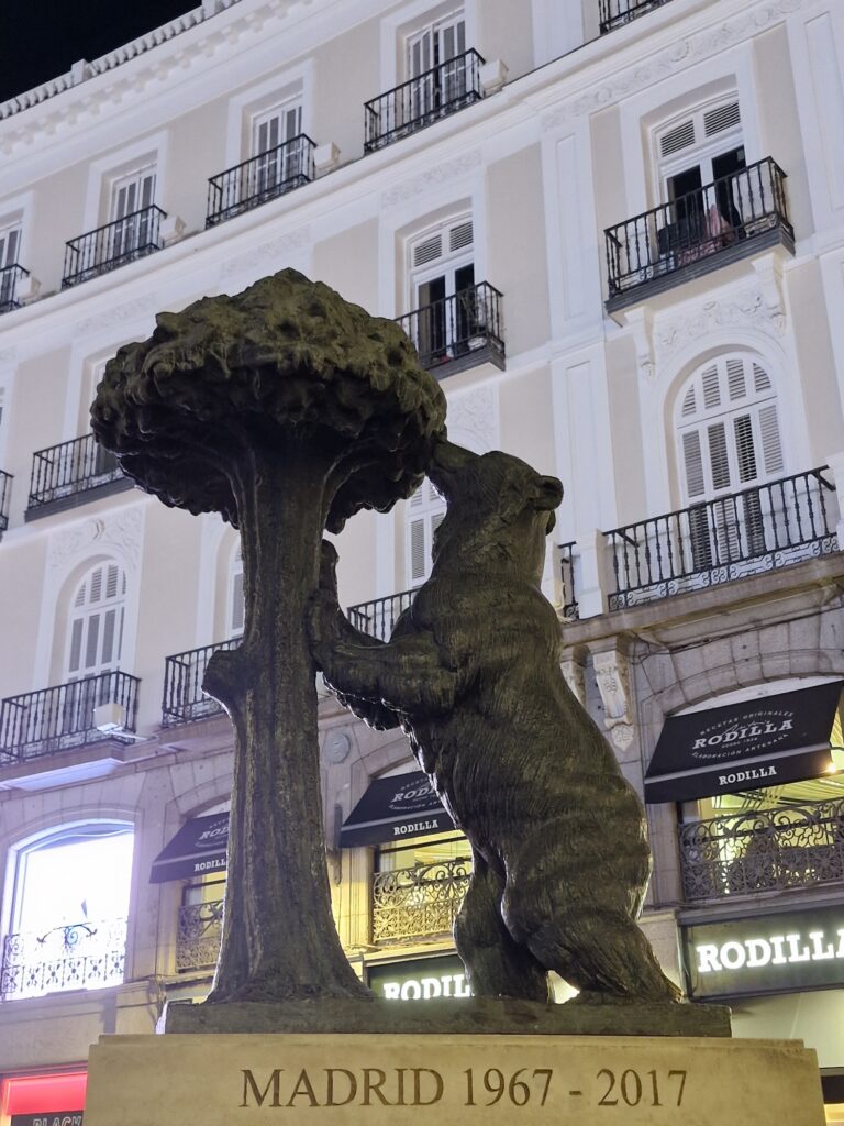 Weiter westlich – vorbei am imposanten Edificio Metrópolis – erreicht man nach ca. 15 Minuten die Puerta del Sol, den bekannten und immer vollen Platz im Zentrum von Madrid, der zugleich Spaniens geographischer und städtischer Mittelpunkt ist (der entsprechende Null-Kilometerstein befindet sich auf der südlichen Seite des Platzes). Auf der östlichen Seite des Platzes wiederum steht die vier Meter hohe Statue El Oso y el Madroño (der Bär und der Erdbeerbaum). Der sich gegen den Baum reckende Bär, der allen Atlético-Fans aus dem Vereinswappen bestens bekannt ist, ist allen voran das Hauptmotiv im Stadtwappen von Madrid. Unweit der Puerta del Sol befindet sich mit der Plaza Mayor vielleicht der berühmteste Platz in ganz Spanien: Ein rechteckiger Platz, der komplett mit viergeschossigen Wohngebäuden umgeben und nur über bogenartige Zugänge erreichbar ist. Indem man die Plaza Mayor über den nordwestlichen Bogen verlässt, erreicht man gleich den Mercado de San Miguel, einen ehemaligen Lebensmittelmarkt in einem architektonisch äußerst interessanten Gebäude, in dem heutzutage unzählige Tapas-Angebote für Einheimische und Touristen angeboten werden. Ein Besuch lohnt sich immer, allerdings nicht an Wochenenden!